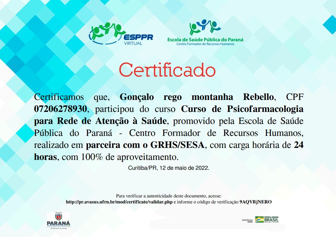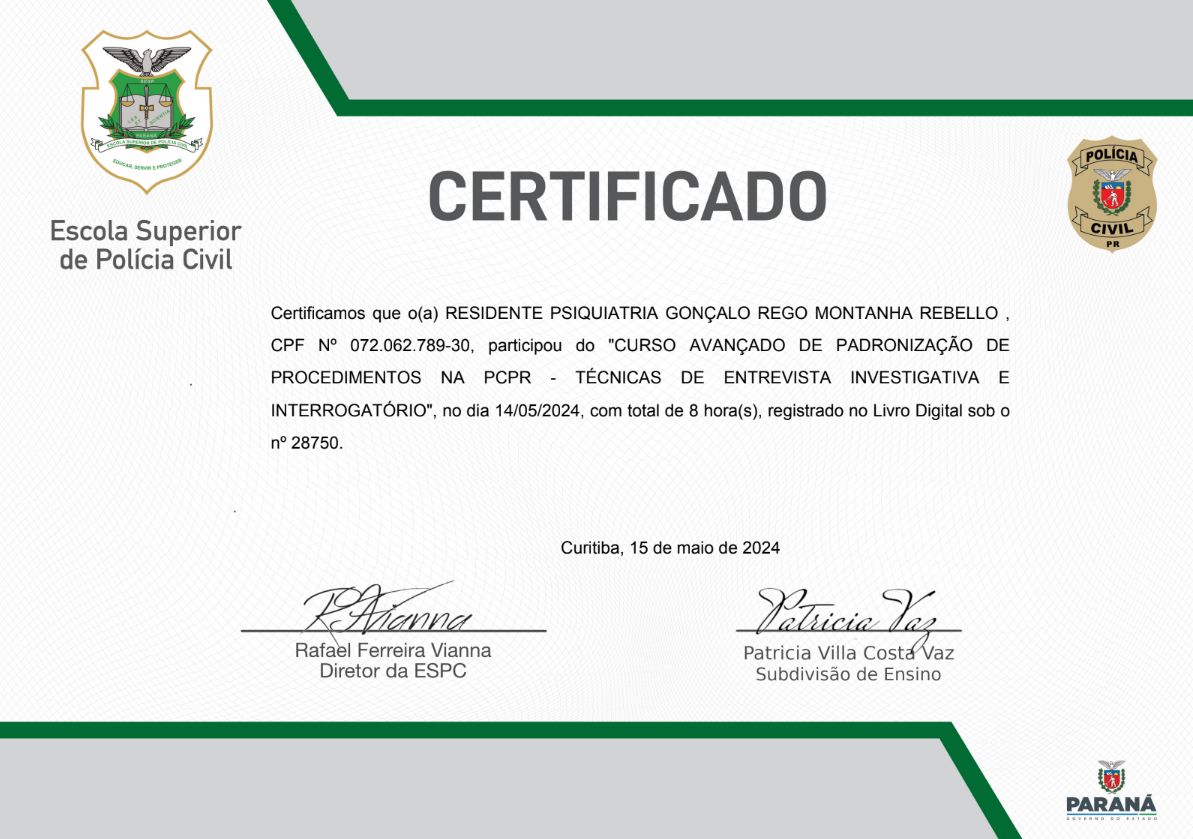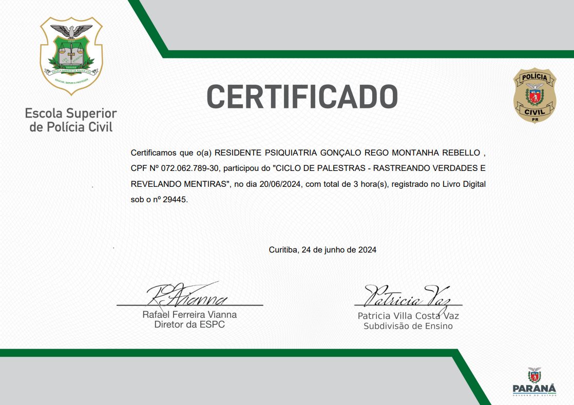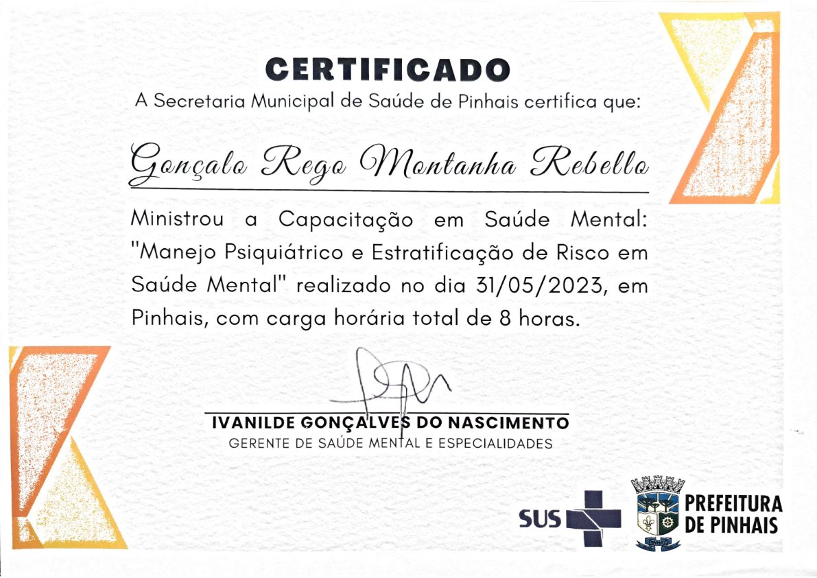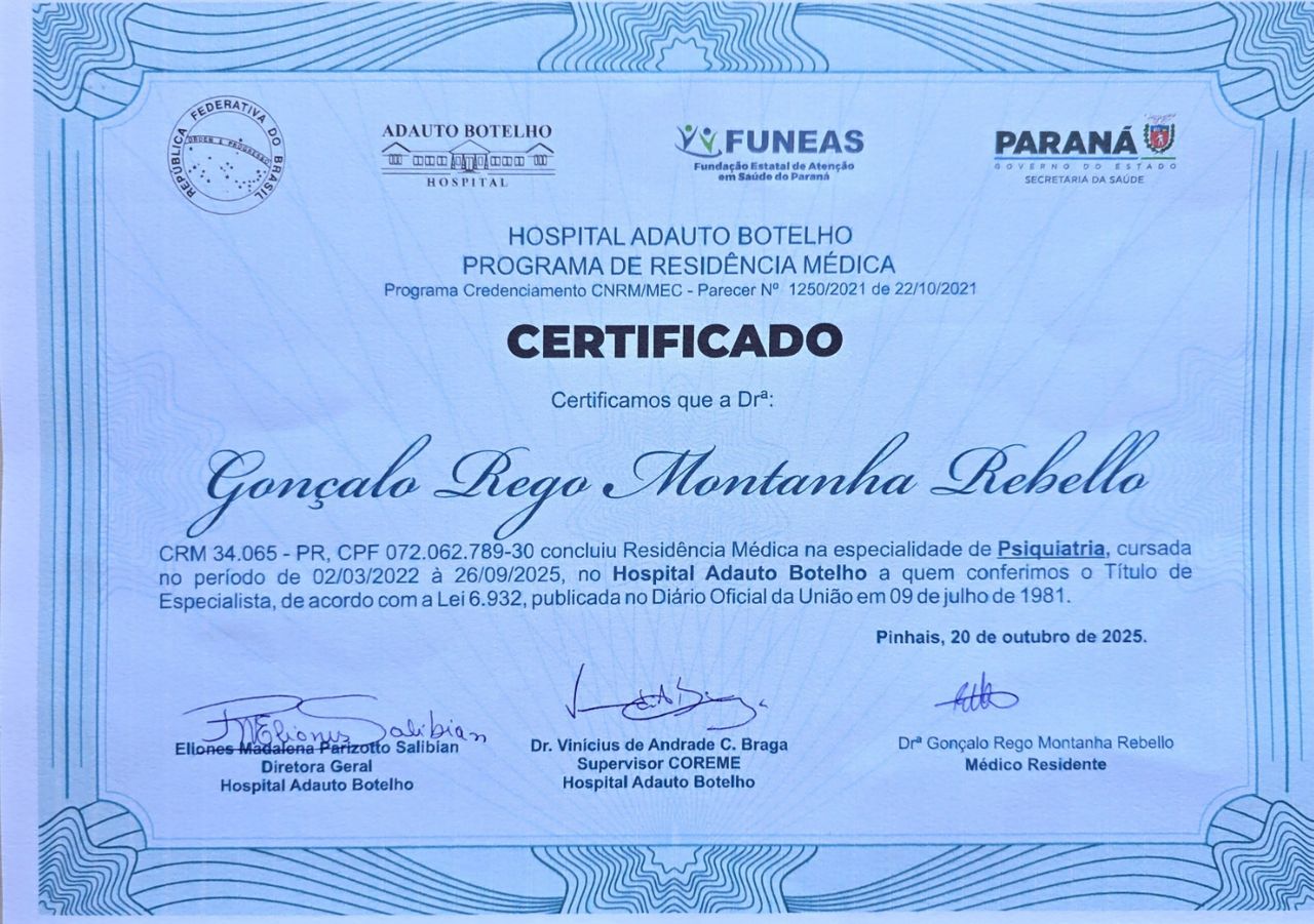 Agradeço imensamente o doutor por ter nós atendido,seus tratamentos foram muito importantes para meu marido,com o doutor foi resolvido os problemas mentais deles ,quando ele estava em tratamento com outro psiquiatra ele só piorava não tinha eficácia no tratamento,quando chegamos com o doutor Gonçalo já na primeira consulta o atendimento foi outro o doutor escutava e explicava o que estava acontecendo com a troca dos remédios o meu marido foi melhorando e com outros remédio em um mês meu marido melhorou 90 por cento ainda ele continua em tratamento,mais meu marido só melhorou com o doutor, porque com outros psiquiatra acho que meu marido já não estava vivo mas graças a Deus conseguimos o tratamento certo que deu resultado.muito obrigada por tudo doutor peso para Deus abençoar grandemente sua vida e de toda sua família, muito obrigada pelo seu atendimento sua compreensão seus conselhos por me ajudar a achar o caminho da luz no fim da escuridão muito obrigada serei eternamente grata.
